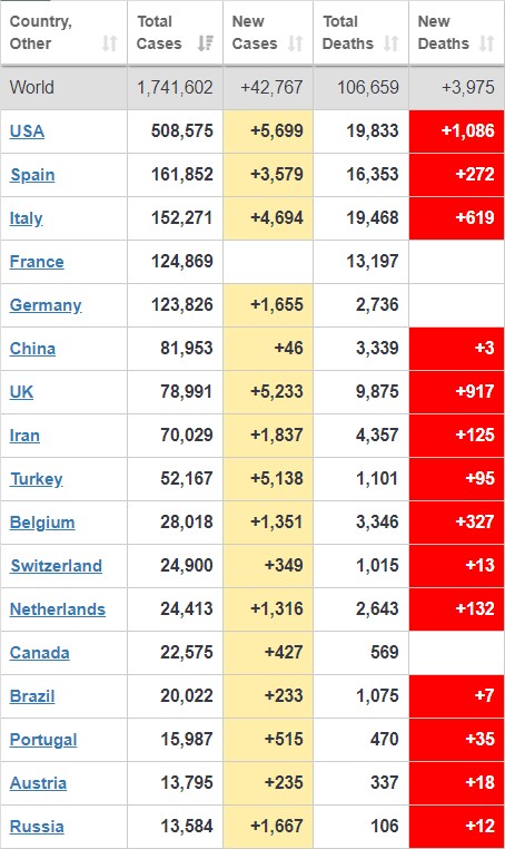 Dünya genelinde koronavirüs nedeniyle en çok ölüm yaşanan ilk 10 ülke şöyle sıralandı: (11 Nisan 2020 Cumartesi günü saat 19.45 itibariyle)