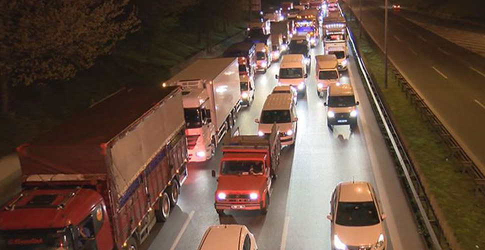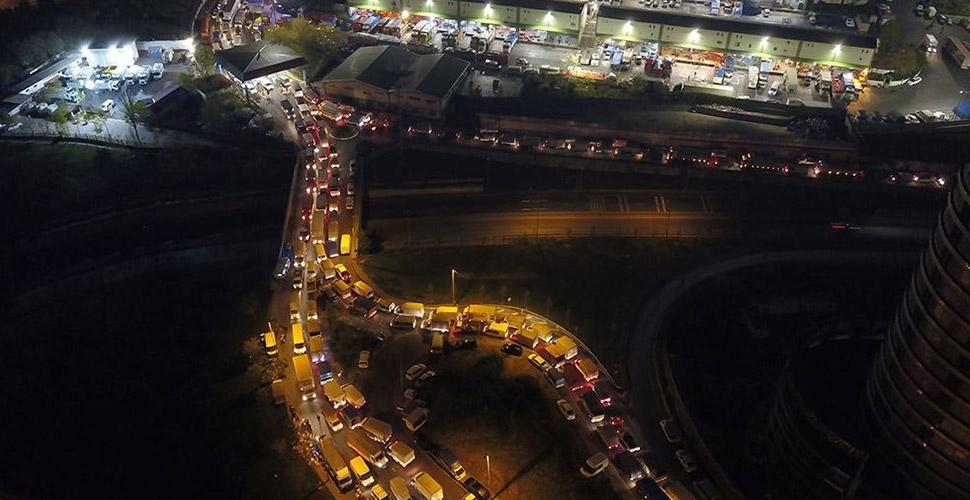Koronavirüs önlemleri kapsamında ilan edilen 4 günlük sokağa çıkma yasağı gece yarısı itibariyle son buldu. Yasağın kalkmasıyla birlikte İstanbul Bayrampaşa'da bulunan sebze ve meyve halinin girişinde uzun araç kuyrukları oluştu.