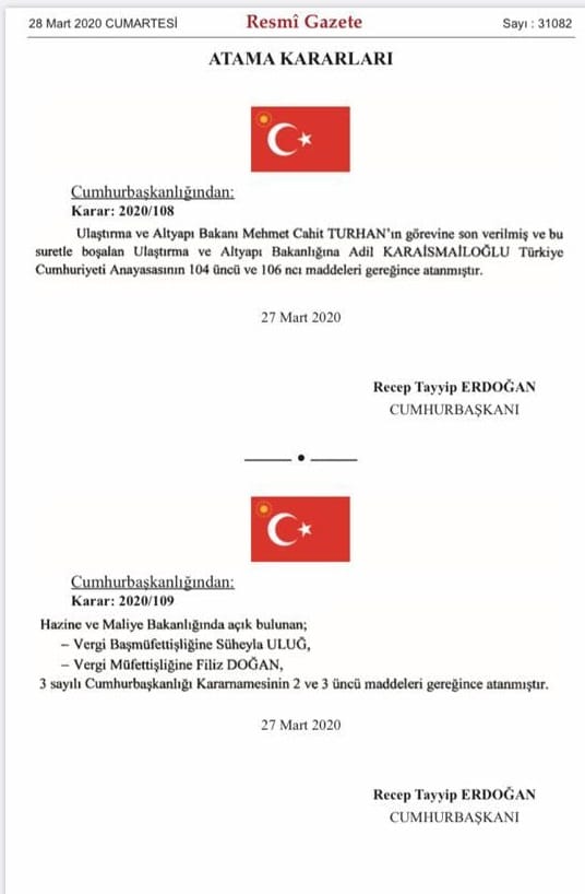 Adil Karaismailoğlu, Cumhurbaşkanlığı kararı ile Mehmet Cahit Turhan'ın yerine atandı. 108 numaralı Cumhurbaşkanlığı kararında, Türkiye Cumhuriyeti Anayasasının 104'üncü ve 106'ncı maddeleri gereğince Karaismailoğlu'nun atamasının yapıldığı belirtildi.