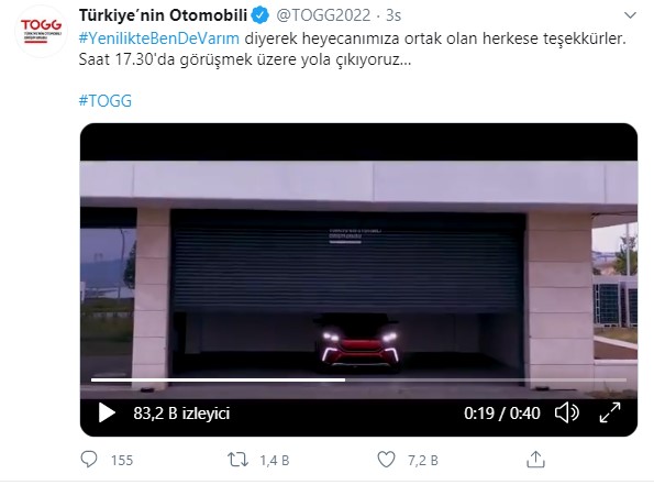 Paylaşımda "#YenilikteBenDeVarım diyerek heyecanımıza ortak olan herkese teşekkürler. Saat 17.30'da görüşmek üzere yola çıkıyoruz… " notuyla, TOGG'un garajdan çıkışını gösteren bir videoya yer verildi.