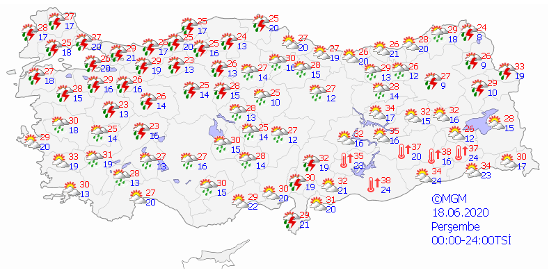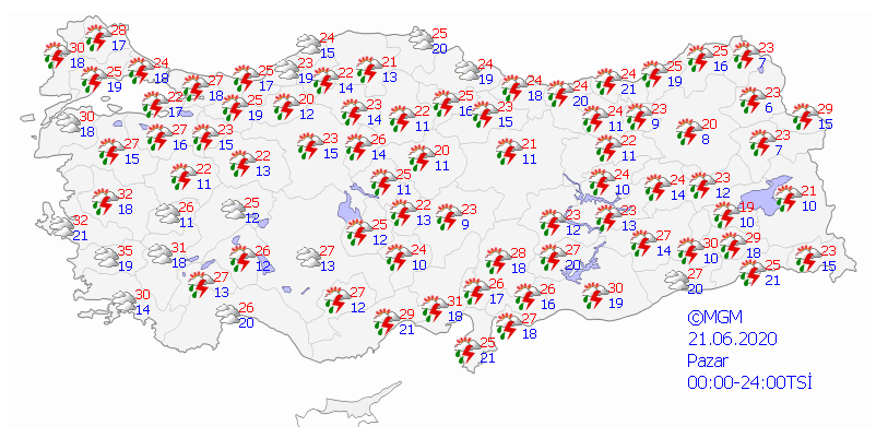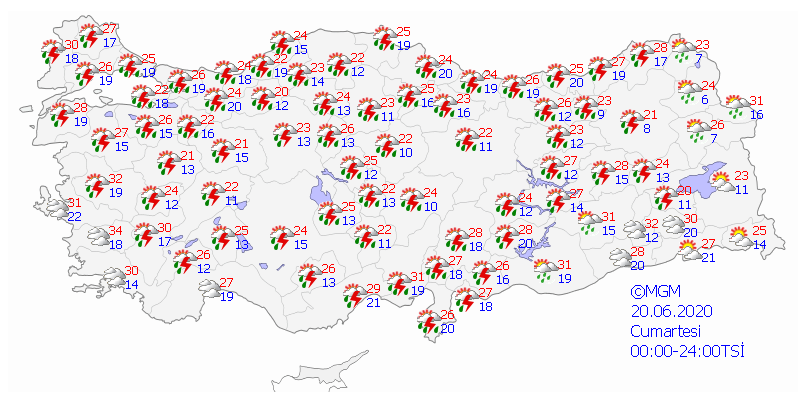 Meteoroloji Genel Müdürlüğü (MGM) tarafından yapılan son değerlendirmelere göre; Trakya Kesimi, İç Ege, Doğu Akdeniz'in toroslar mevkii, İç Anadolu’nun kuzeyi, Karadeniz'in iç kesimleri, Doğu Anadolu'nun kuzeyi ile Sakarya, Bilecik, Bursa, Zonguldak, Bartın çevreleri, Kastamonu'nun kıyı ilçeleri, İstanbul'un batı ilçeleri ve Çanakkale'nin doğu ilçelerinin yerel olmak üzere sağanak ve gök gürültülü sağanak yağışlı geçeceği tahmin ediliyor. Yağışların Edirne ve Kırklareli çevrelerinde kısa süreli ve yerel olmak üzere kuvvetli olması bekleniyor.