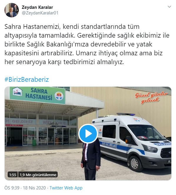 Belediye Başkanı Zeydan Karalar, sahra hastanesinin hizmete hazır olduğunu şu sözlerle duyurmuştu: "Sahra Hastanemizi, kendi standartlarında tüm altyapısıyla tamamladık. Gerektiğinde sağlık ekibimiz ile birlikte Sağlık Bakanlığı'mıza devredebilir ve yatak kapasitesini artırabiliriz. Umarız ihtiyaç olmaz ama biz her senaryoya karşı tedbirimizi almalıyız. #BirizBeraberiz"