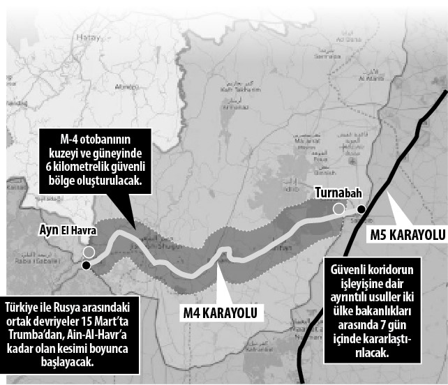 3-Türk-Rus ortak devriyeleri, 15 Mart 2020 tarihinde M4 karayolunun Trumba’dan (Serakib’in 2 km batısı) Ain-Al-Havr’a kadar olan kesimi boyunca başlatılacaktır.