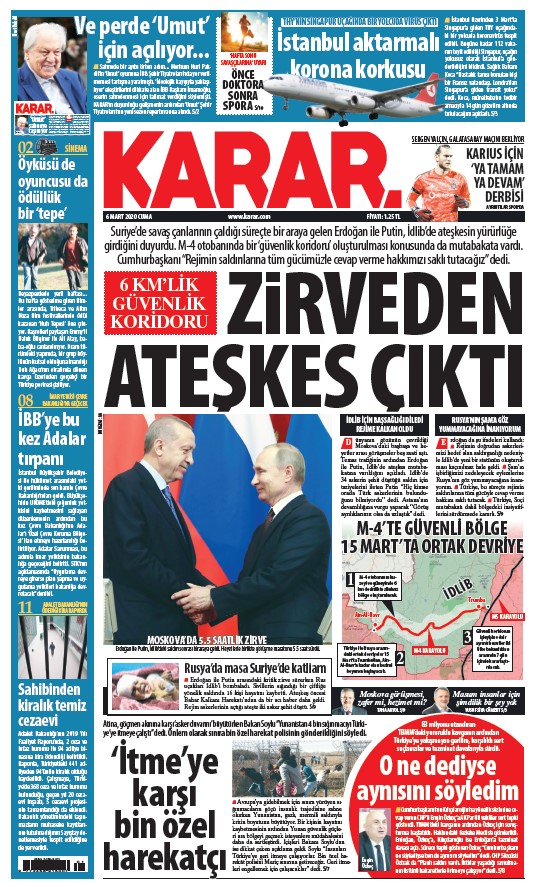 İdlib’te 34 askerin şehit edilmesinin ardından Cumhurbaşkanı Erdoğan ile Rusya lideri Putin arasında yapılması planlanan zirve dün Moskova’da gerçekleşti. 5 saat 40 dakika süren zirveden ateşkes ve insani koridor açılmasına yönelik mutabakat çıktı. Dünyanın soluğunu keserek sonuçlarını takip ettiği Moskova zirvesinde Cumhurbaşkanı Erdoğan’ın söylediği ‘ilk hedefimiz acil ateşkes’ kararı çıktı. Erdoğan ile Putin’in Moskova’daki zirvesi saat 14.00’de başladı. Erdoğan ve Putin, baş başa görüşmeleri öncesi kısa birer açıklama yaptı. Erdoğan “Bu görüşmeyi Türkiye’de yapacaktık ama sizin çalışmalarınız nedeniyle burada gerçekleştiriyoruz. Bu görüşme büyük önem arz ediyor. Bölge sıkıntılı. Dünyanın gözü burada. Burada alacağımız kararların bölgeyi ve ülkelerimizi rahatlayacağına inanıyorum. Türkiye-Rusya ilişkilerinin tavan yaptığı bir dönemi yaşıyoruz. Bunları çok daha ileri taşımamızın hesaplarını yapıyoruz. Ve bunu da başaracağımıza inanıyorum. Tekrar bu kabul için teşekkür ediyorum” dedi.